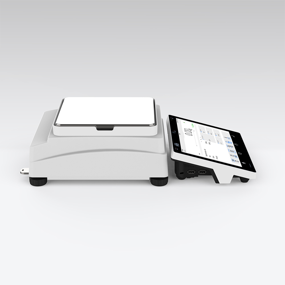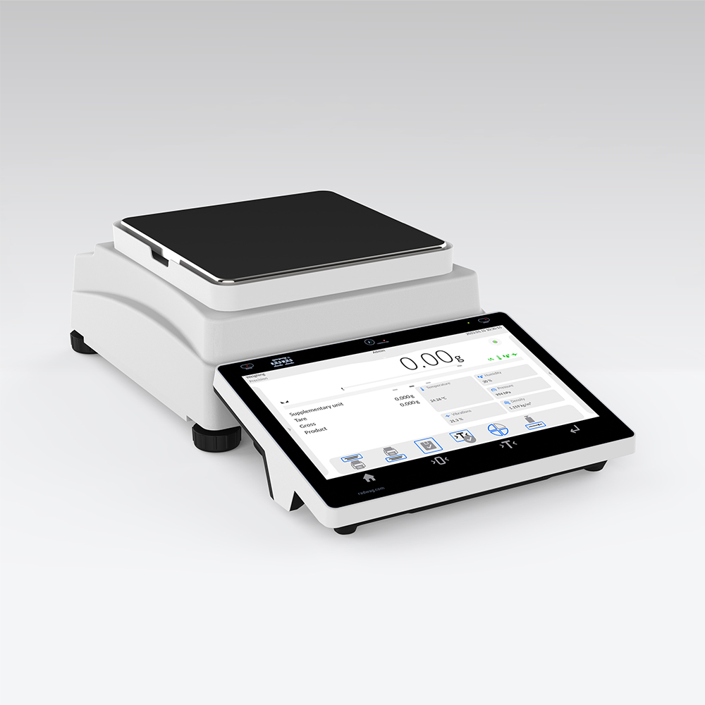 La función de densidad de cuerpos sólidos o líquidos utiliza el principio de Arquímedes y requiere un kit especial para su aplicación. Cuando se utiliza el kit, reemplaza un platillo de pesaje. En el caso de los sólidos, la masa de la muestra se debe determinar primero en el aire y luego en el líquido de densidad especificada. En el caso de los líquidos, el llamado elemento de inmersión, cuya densidad se ha determinado, se debe medir primero en el aire y luego en el líquido analizado. El proceso de determinación de la densidad se ve alterado por las burbujas de aire que pueden adherirse a la muestra medida o al elemento de inmersión. En el caso de los equipos de laboratorio, se pueden medir sólidos muy ligeros. En el caso de la industria, la densidad de los cuerpos sólidos se puede determinar mediante pesaje debajo del platillo. De esta manera se pueden medir cargas de prueba de tamaño significativo.